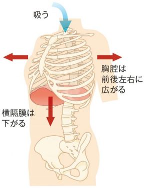 先ほどもご説明したよいに胸が天井の方に動き、肋骨の下は、横に膨らみます。