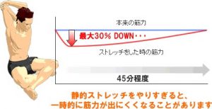 実際に運動前に行うことで、最大30%筋力が低下するというデータもあります。