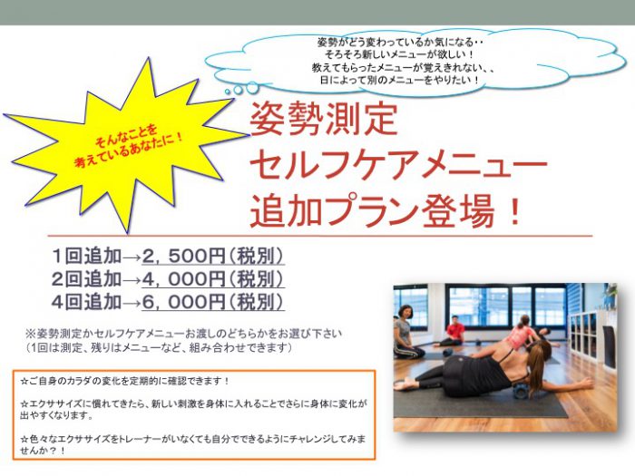 セルフケアメニューまたは姿勢測定(撮影+解説)を追加するプランをご用意させていただきました。