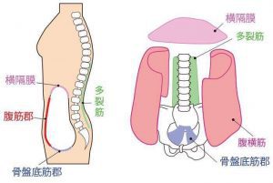 骨盤を後傾し息を吐くことでコアの筋肉(横隔膜、腹横筋、多裂筋、骨盤底筋群)が働き、