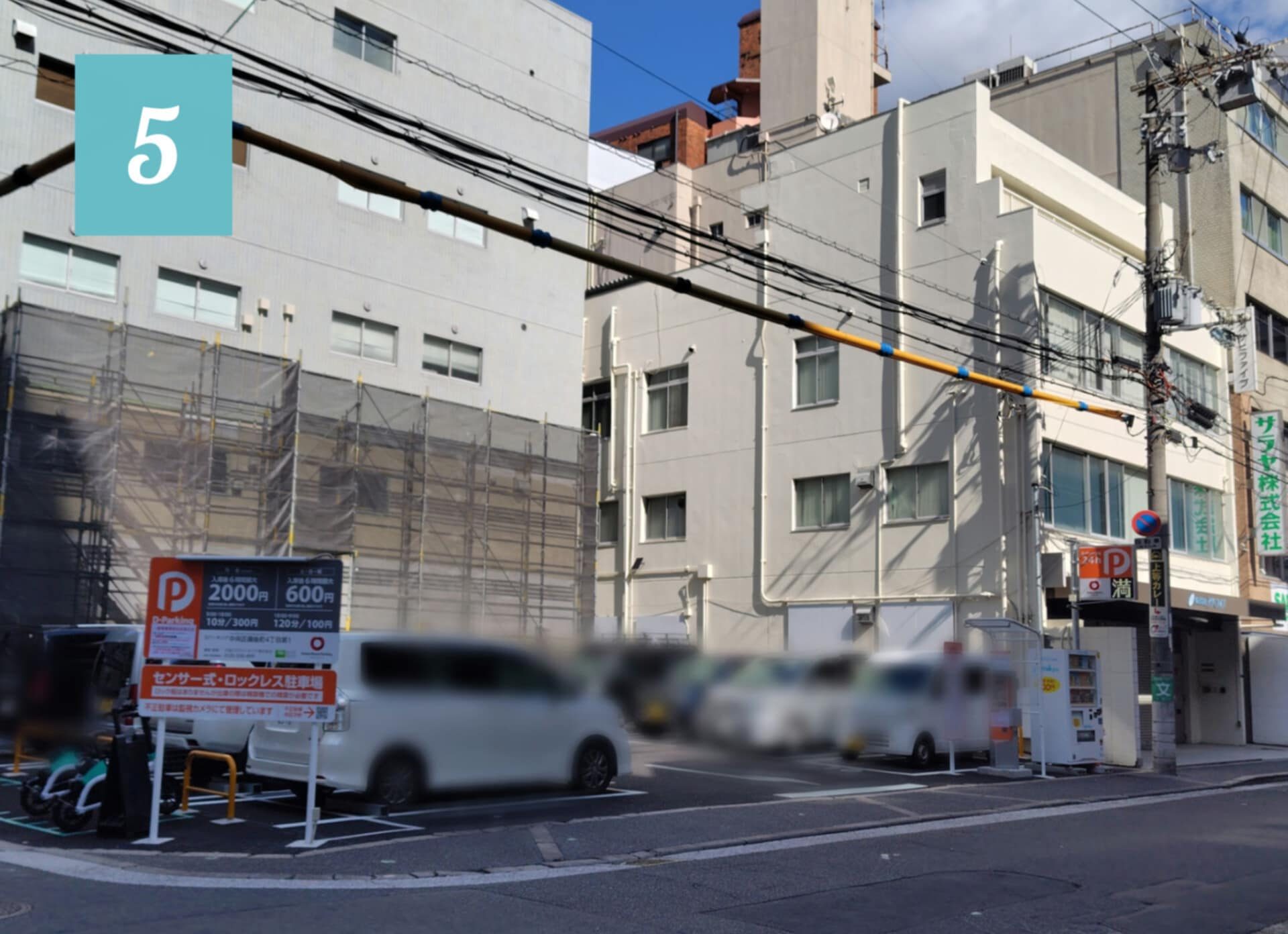 右手にコインパーキングが見えたら、右に曲がります。